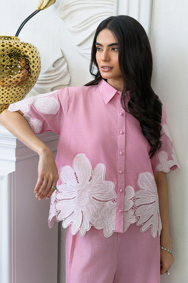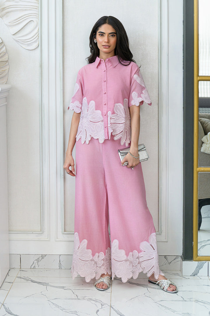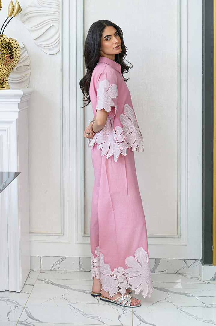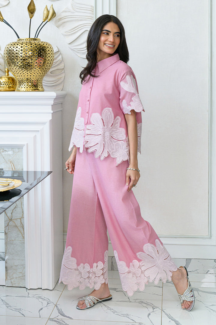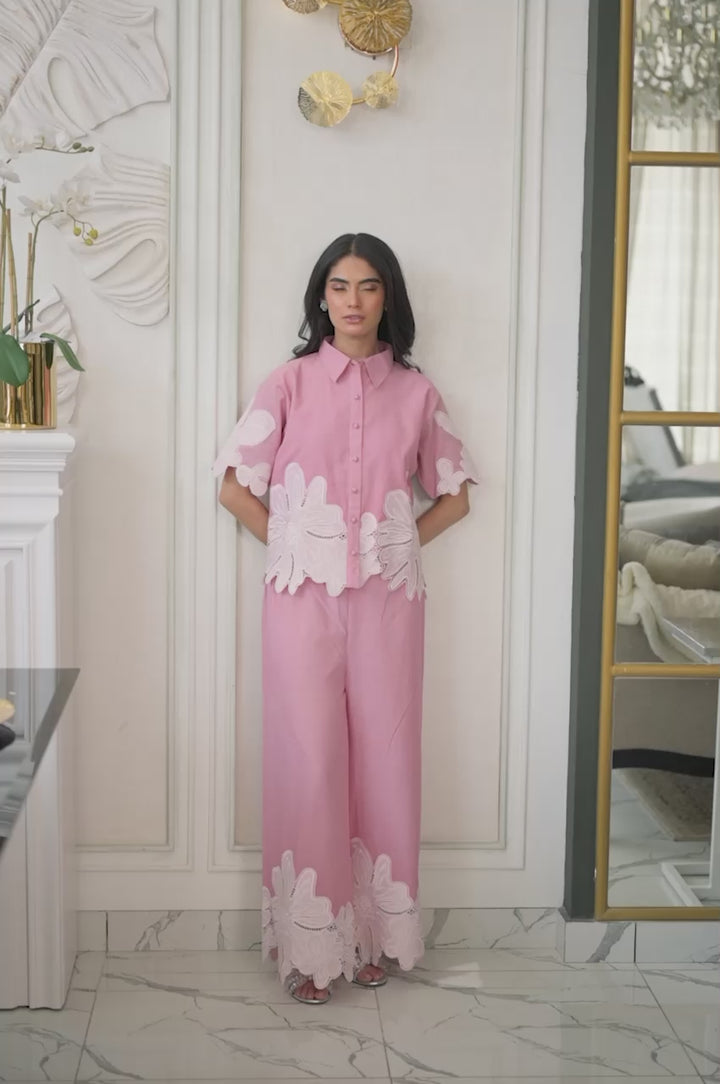 Bask in the sun-kissed days with this dreamy baby pink co-ord set. Effortlessly chic and endlessly comfortable, this set features a breezy, button-down top and relaxed, wide-leg pants. Delicate white floral appliques bloom across both pieces, adding a touch of whimsical charm. Perfect for everyday adventures, this set is your go-to for a fresh, summery vibe.