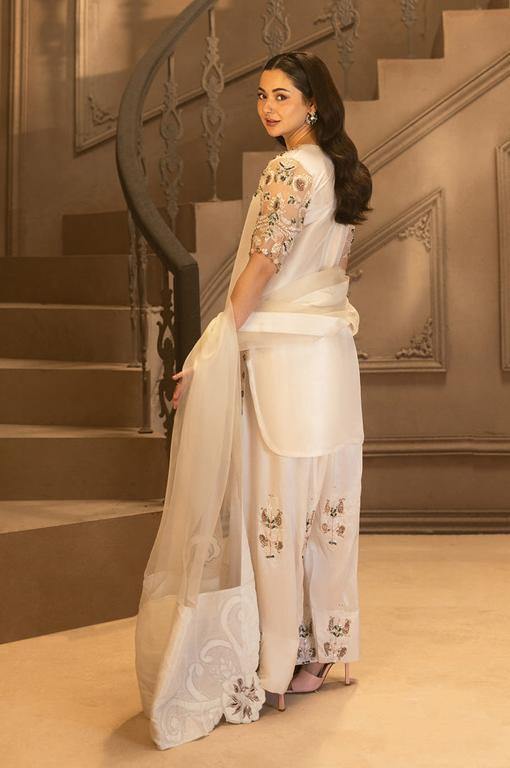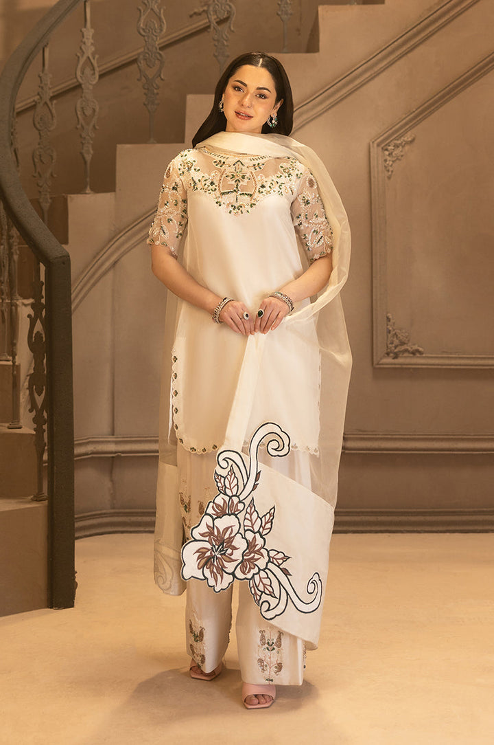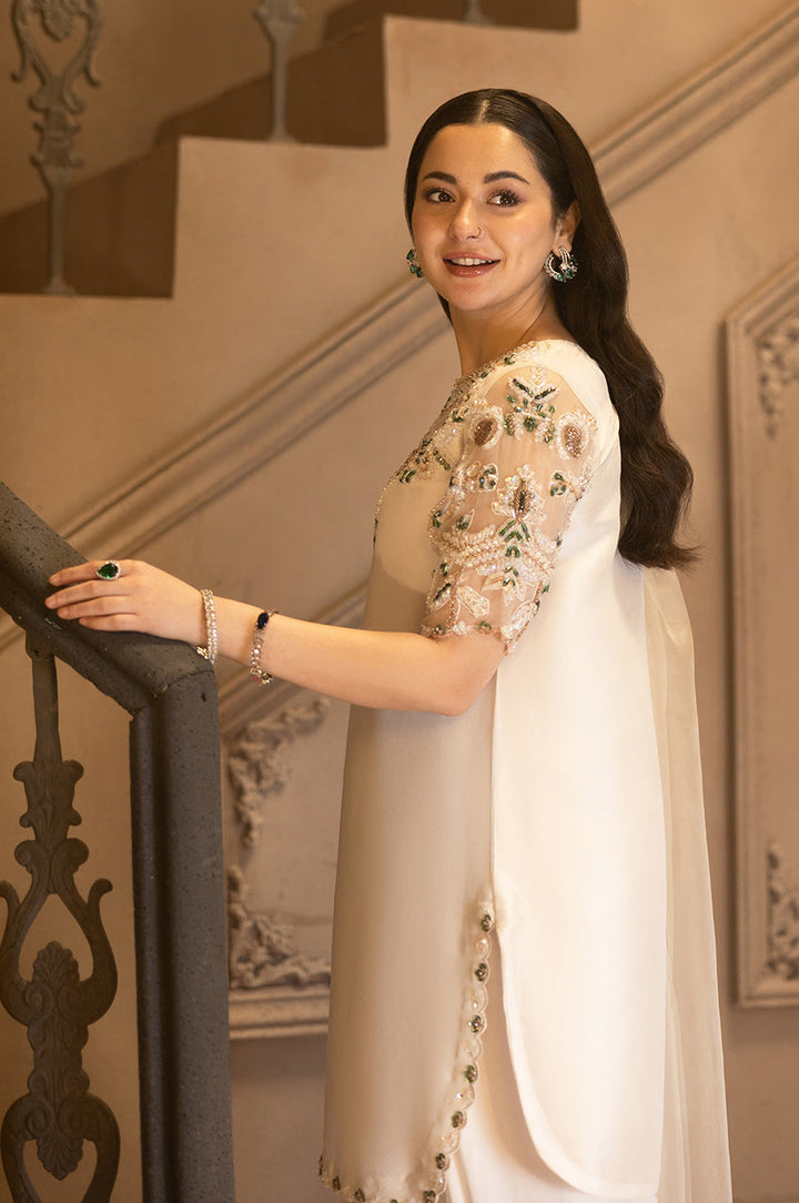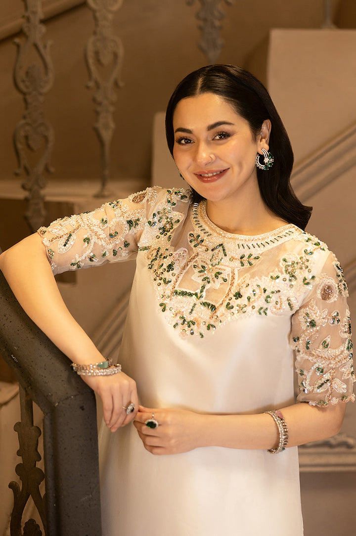 This elegant white ensemble showcases a refined fusion of subtle glamour and traditional charm. The neckline sparkles with a tasteful blend of white and green crystals, while the sheer organza sleeves mirror the same delicate embellishment, offering a hint of contemporary flair. Paired with a motif-detailed farshi shalwar and a finely embroidered organza dupatta, the outfit is both graceful and complete.