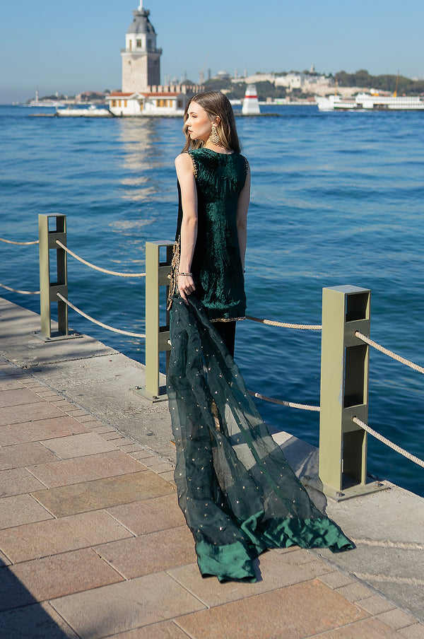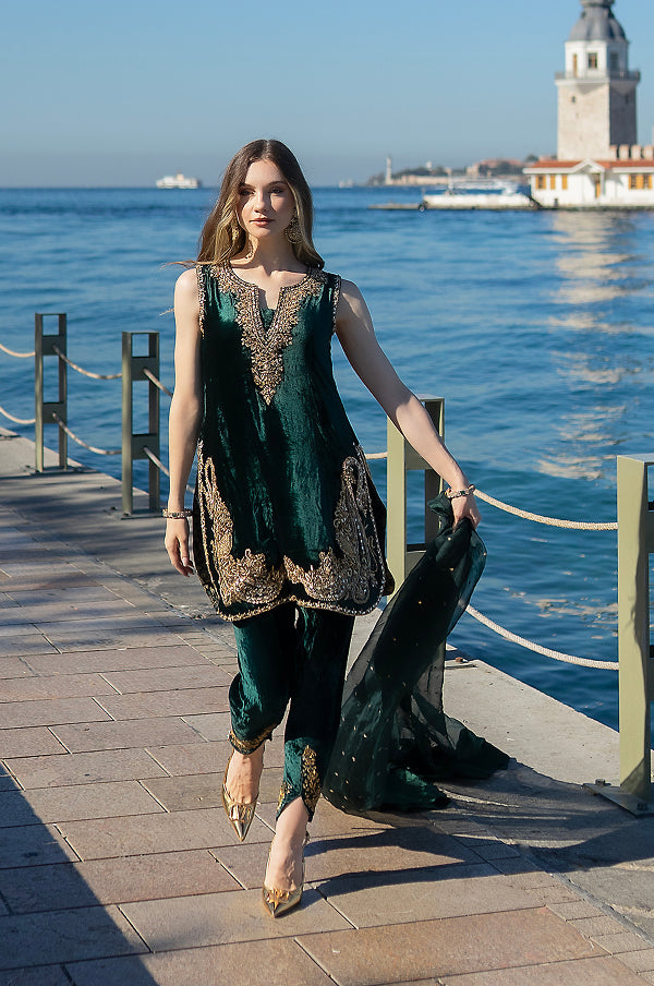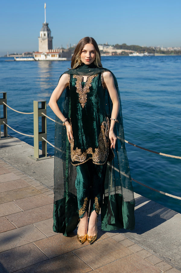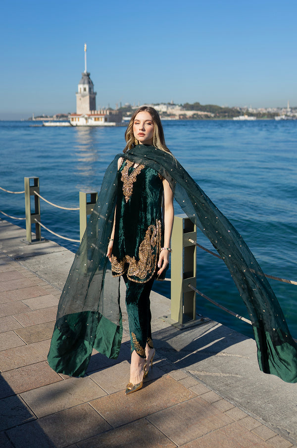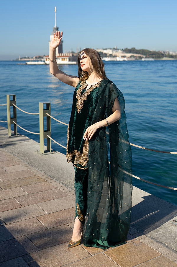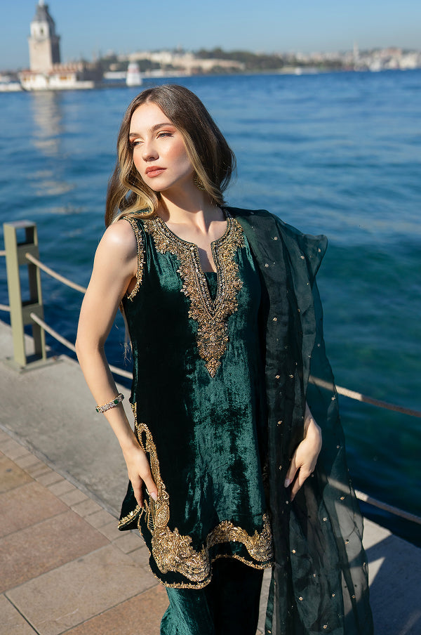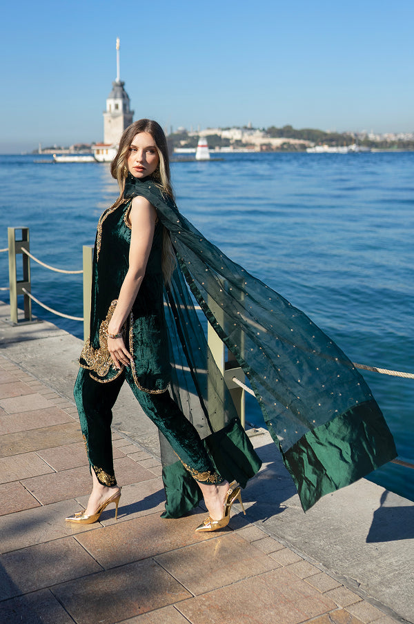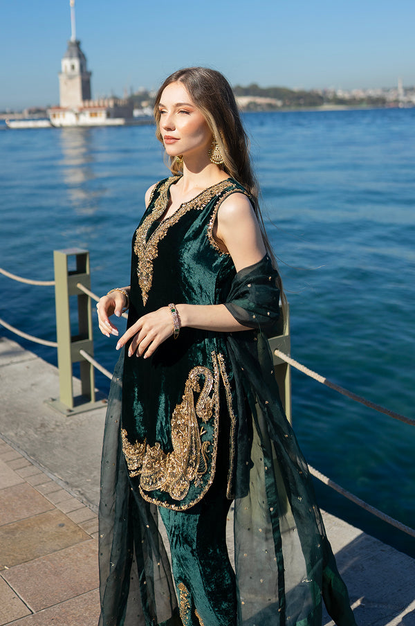 This regal outfit features a velvet shirt in a deep emerald hue, adorned with antique gold embroidery along the neckline, sides, and daman, exuding timeless elegance. The look is completed with tulip pants embellished with delicate handwork at the hem, adding a touch of sophistication.