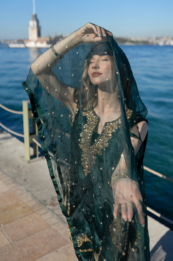 Emerald Velvet Ensemble with Antique EmbellishmentsThis regal outfit features a velvet shirt in a deep emerald hue, adorned with antique gold embroidery along the neckline,...