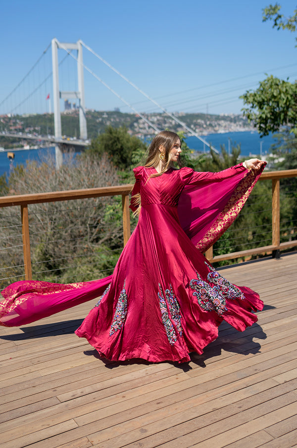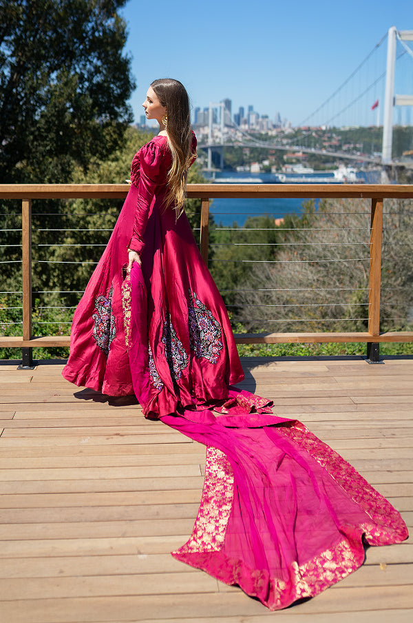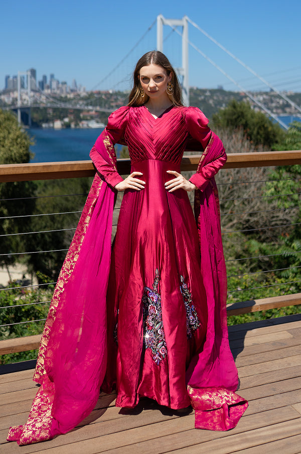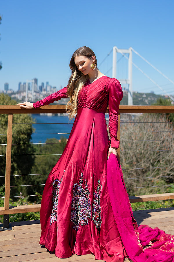 Design Details: The gown features exquisite handwork along the panels and hemline, adding intricate detail and depth to its royal look. The full sleeves and graceful neckline enhance the sophistication, giving the outfit a Rapunzel-inspired, regal vibe.