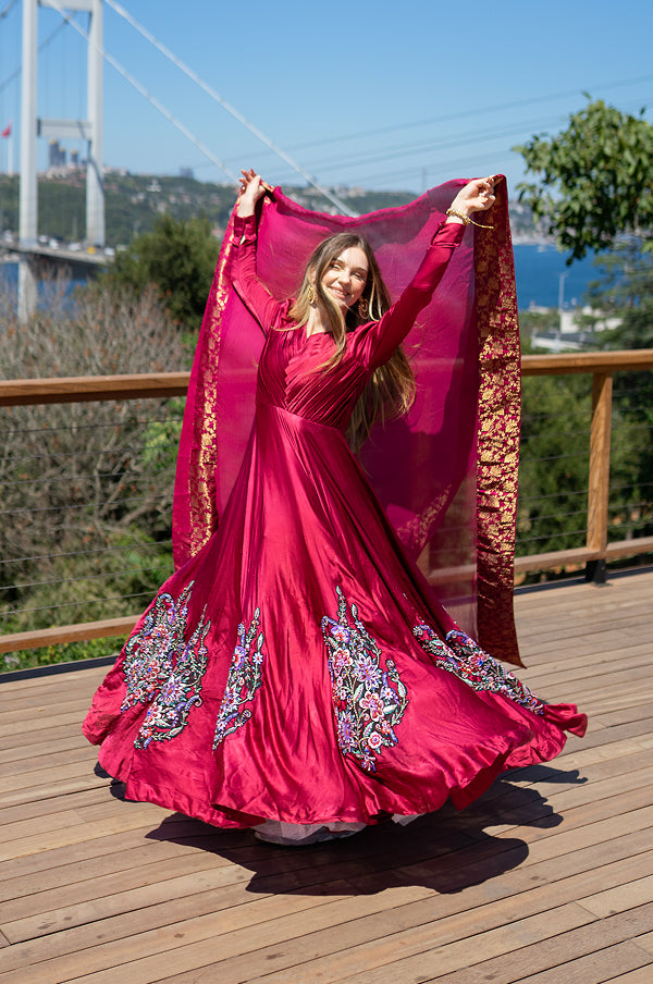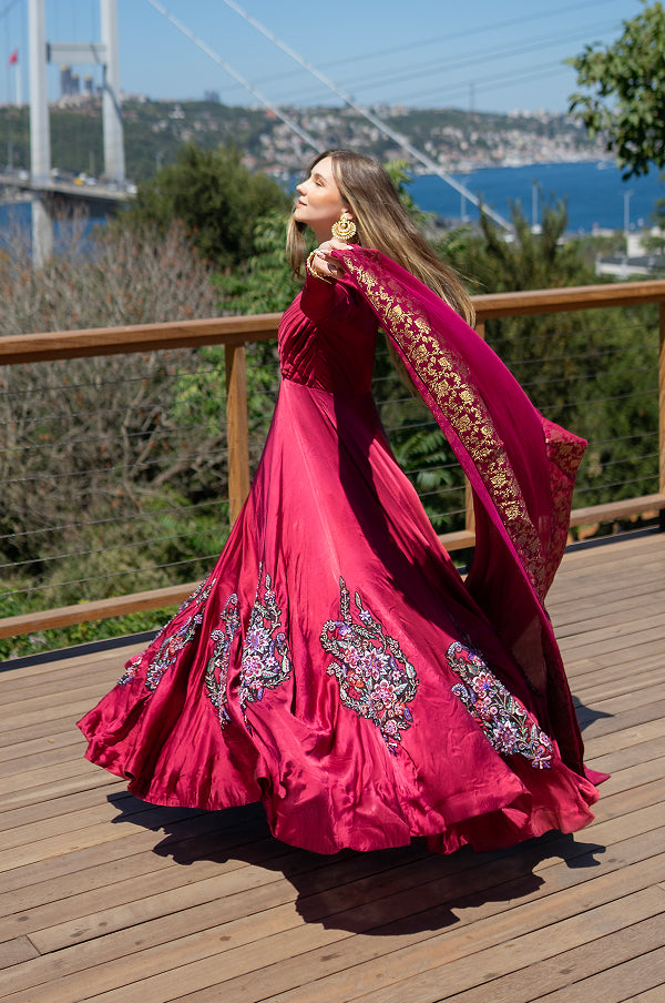 Dupatta: Paired with a chiffon dupatta, lightly embellished yet flowing, it complements the gown perfectly and completes the ethereal aesthetic.
