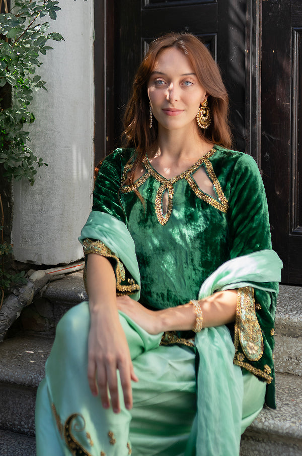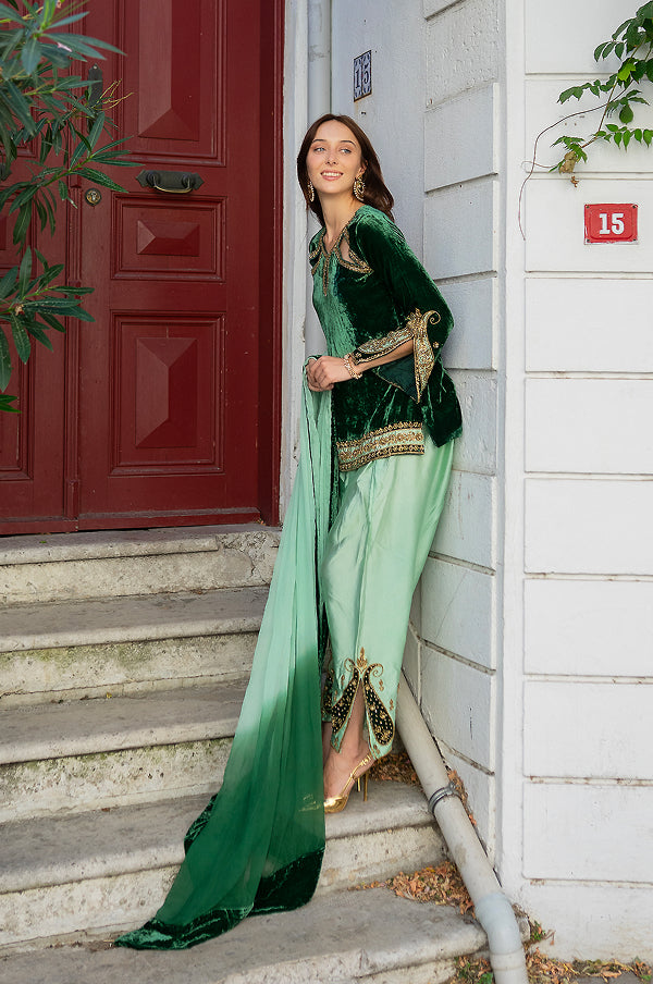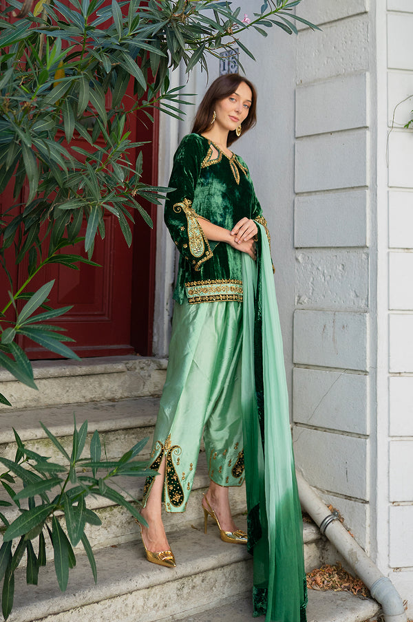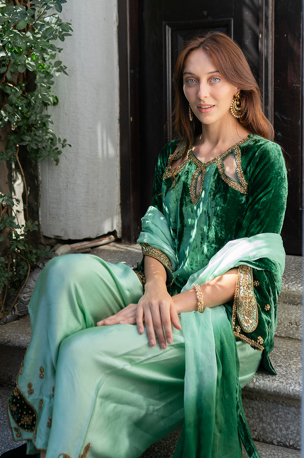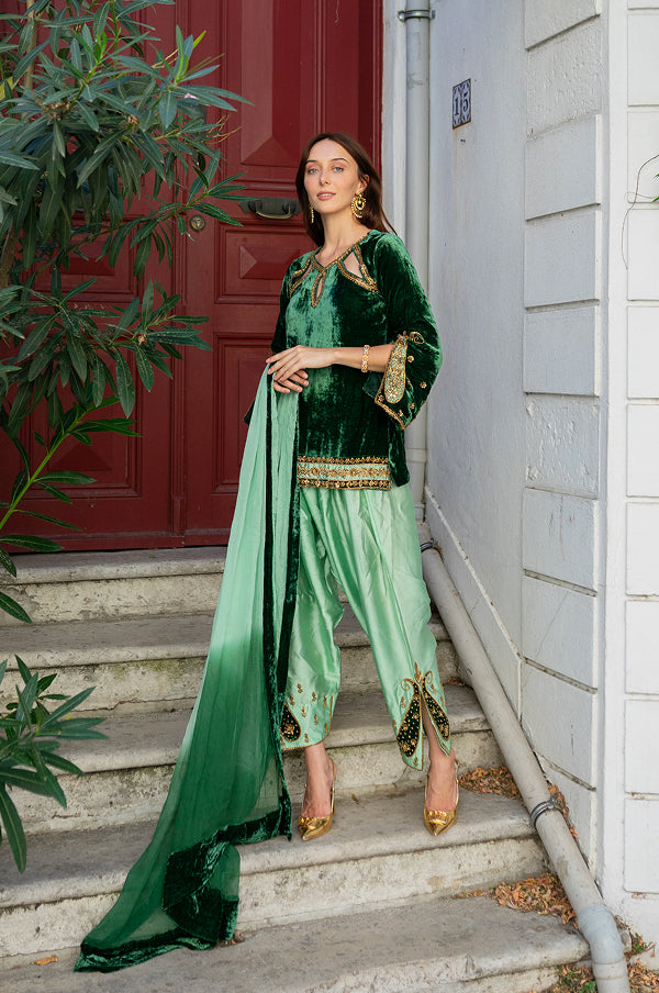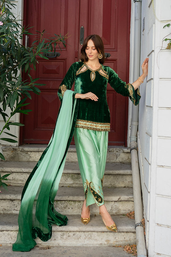 Dupatta: A chiffon dupatta with a two-tone color effect adds a light, graceful balance to the heavier velvet shirt.