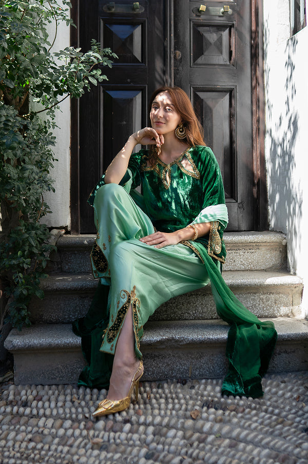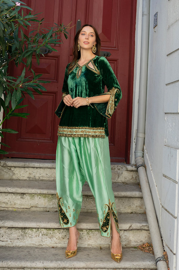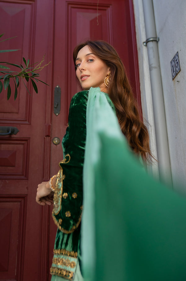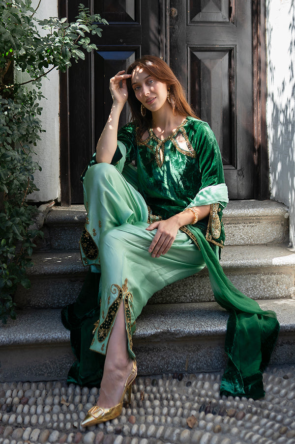 Overall style: The outfit combines classic elegance with modern touches. The pairing of deep green tones with subtle sheen gives it a regal, festive charm.